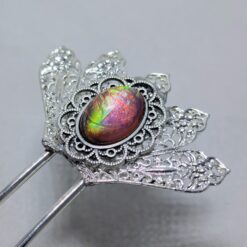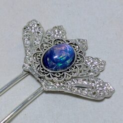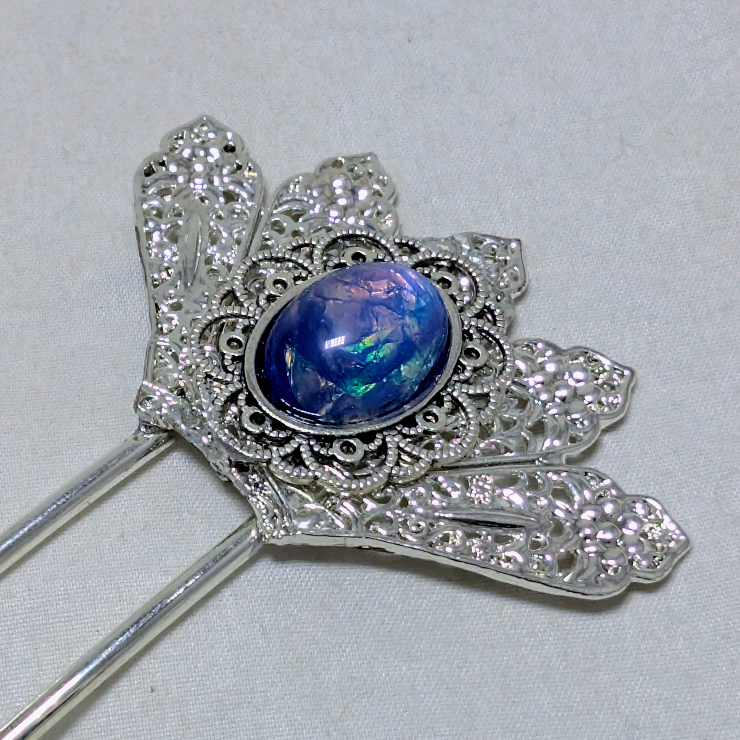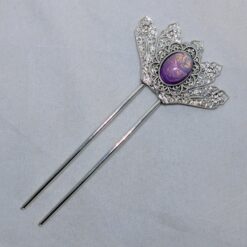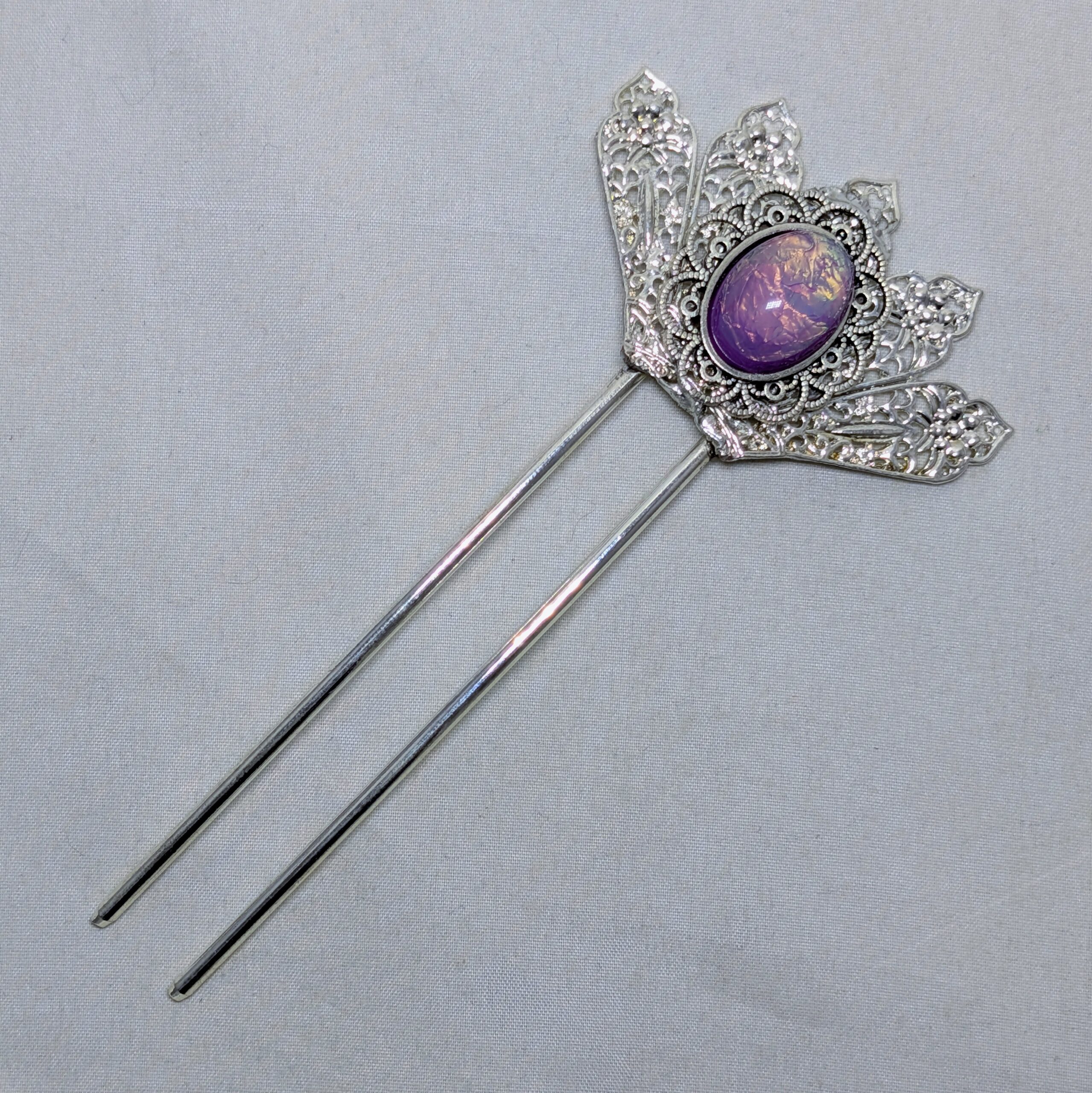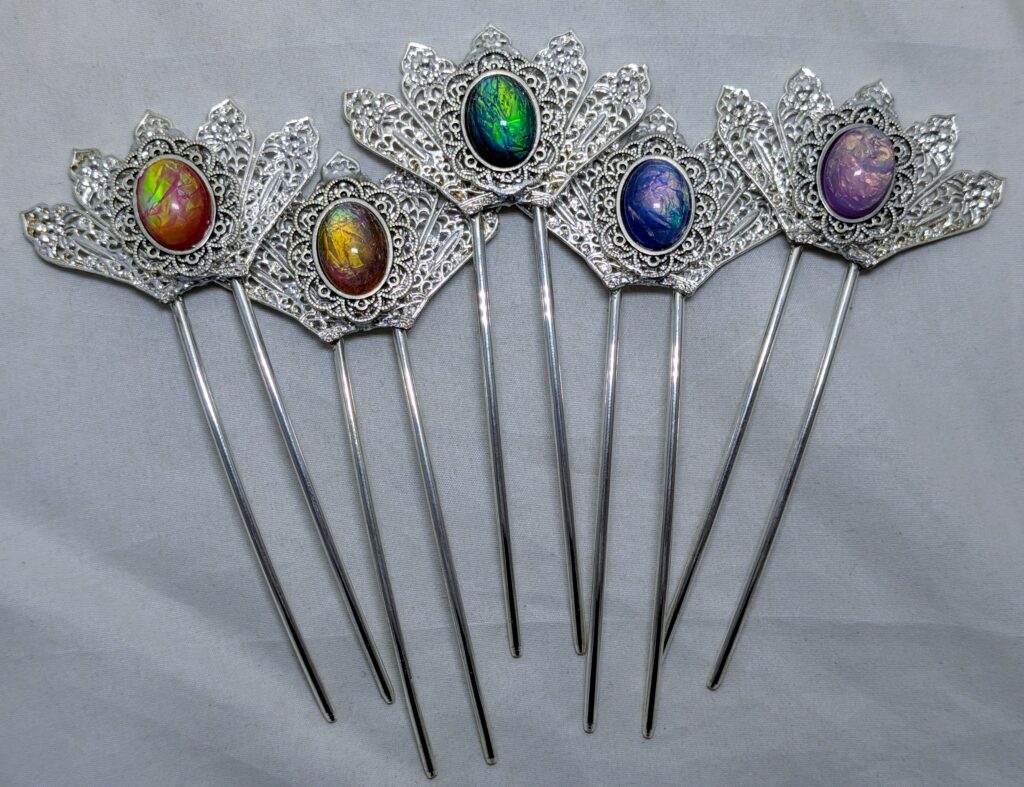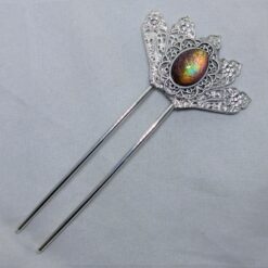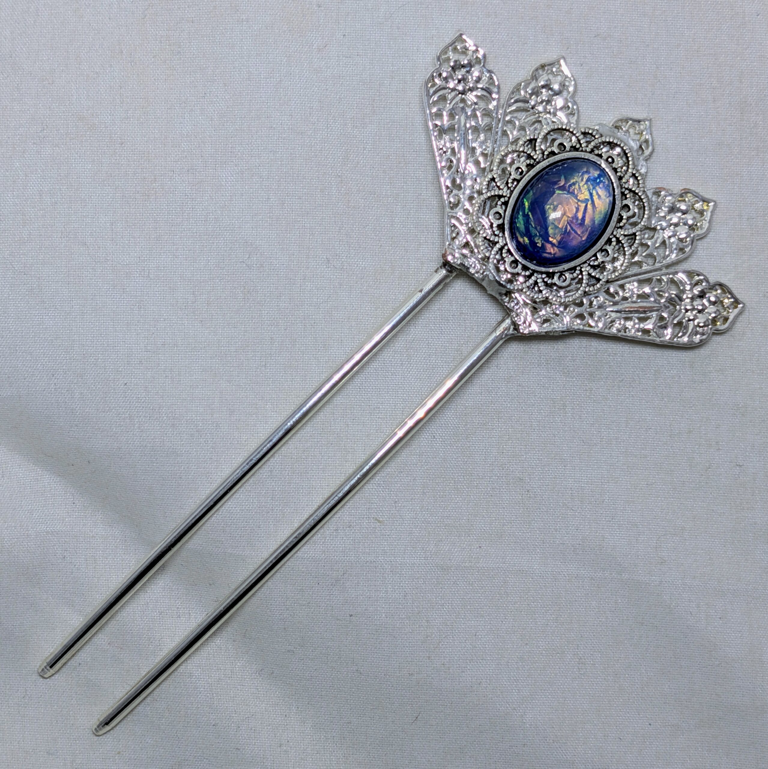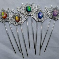 One silver-plated hair fork with a crown-like soldered silver alloy top, decorated with resin opals or cameo cabochons. These ones have a nice curve to fit along your head, which makes them even more comfortable than the usual ones!