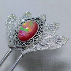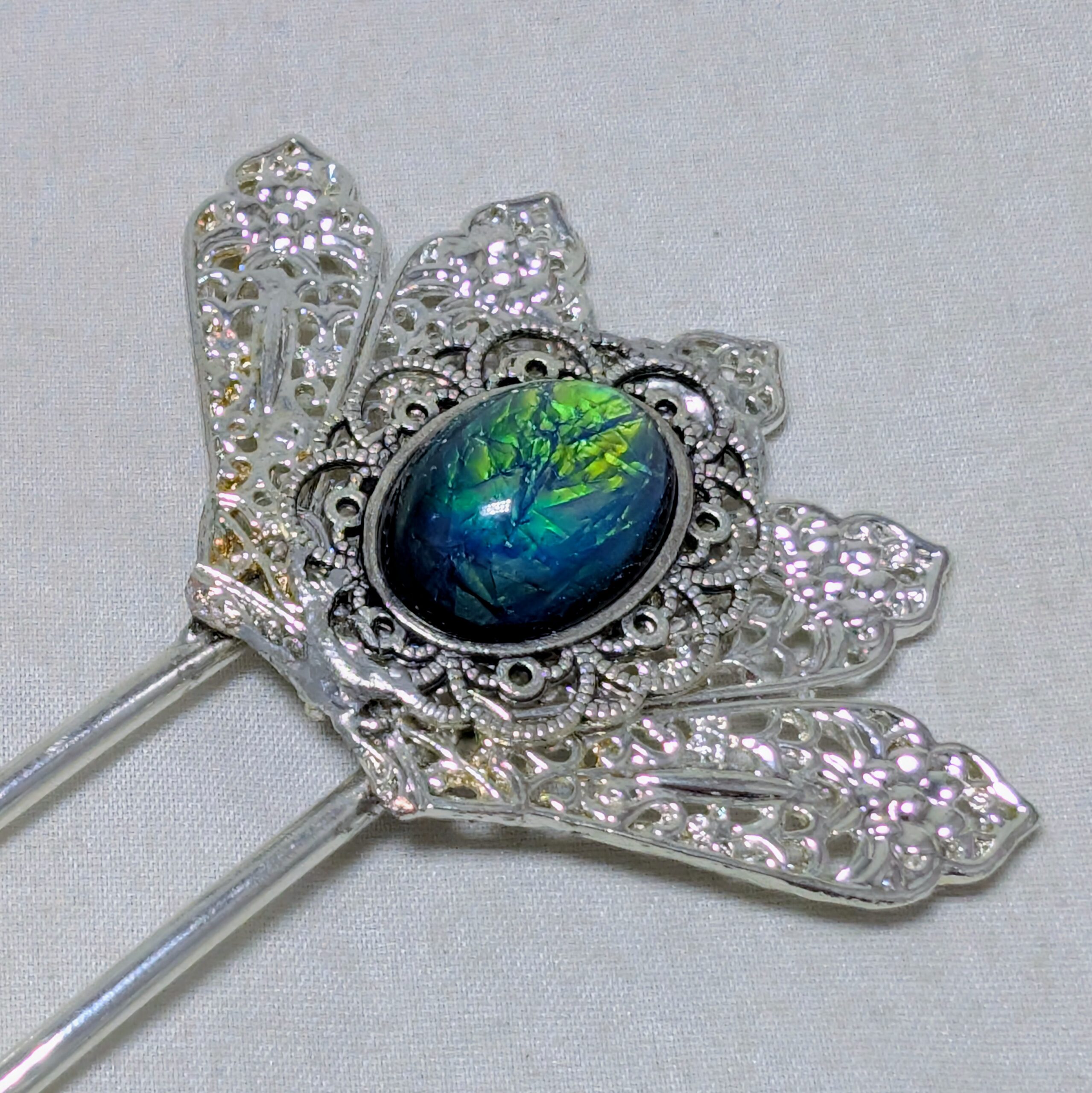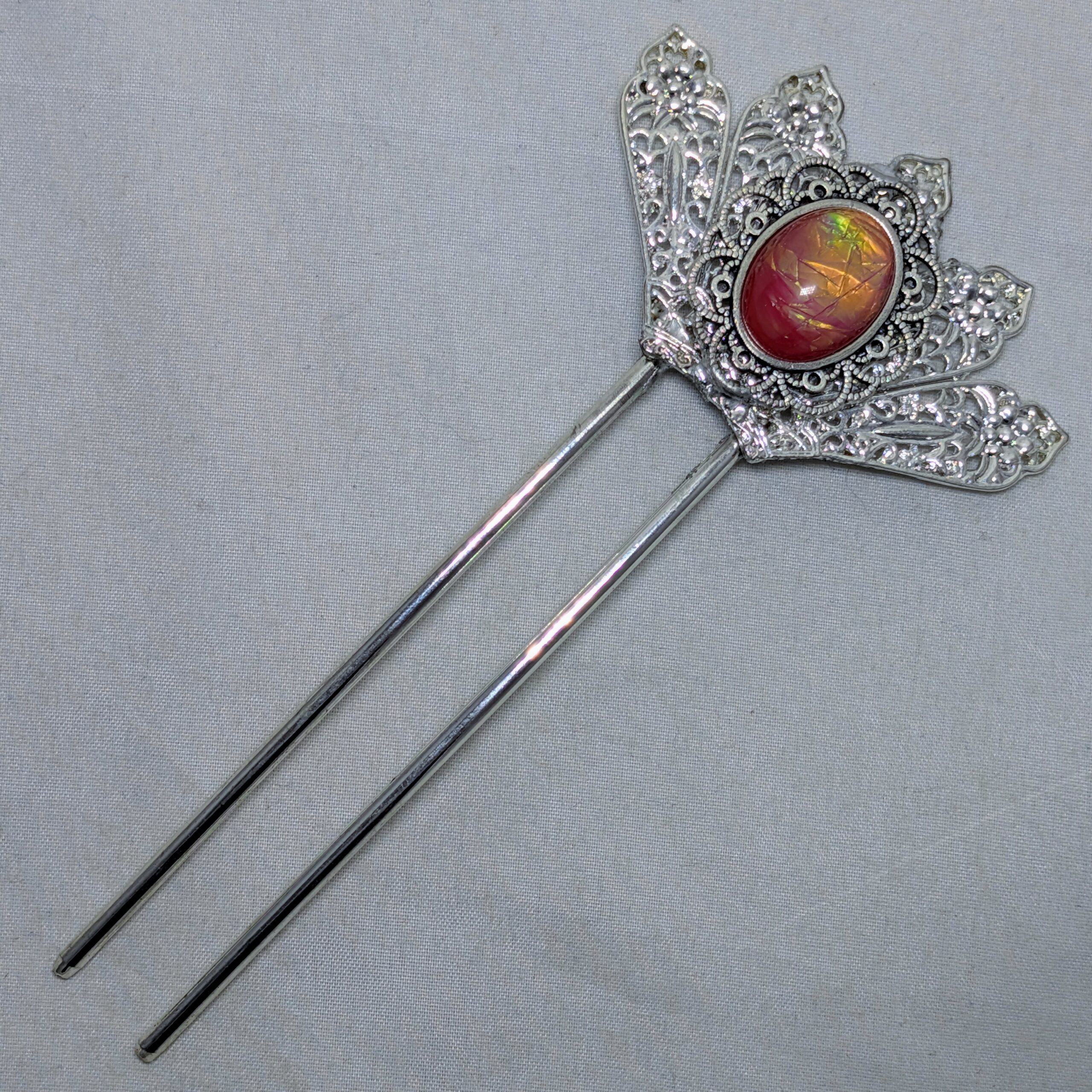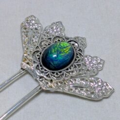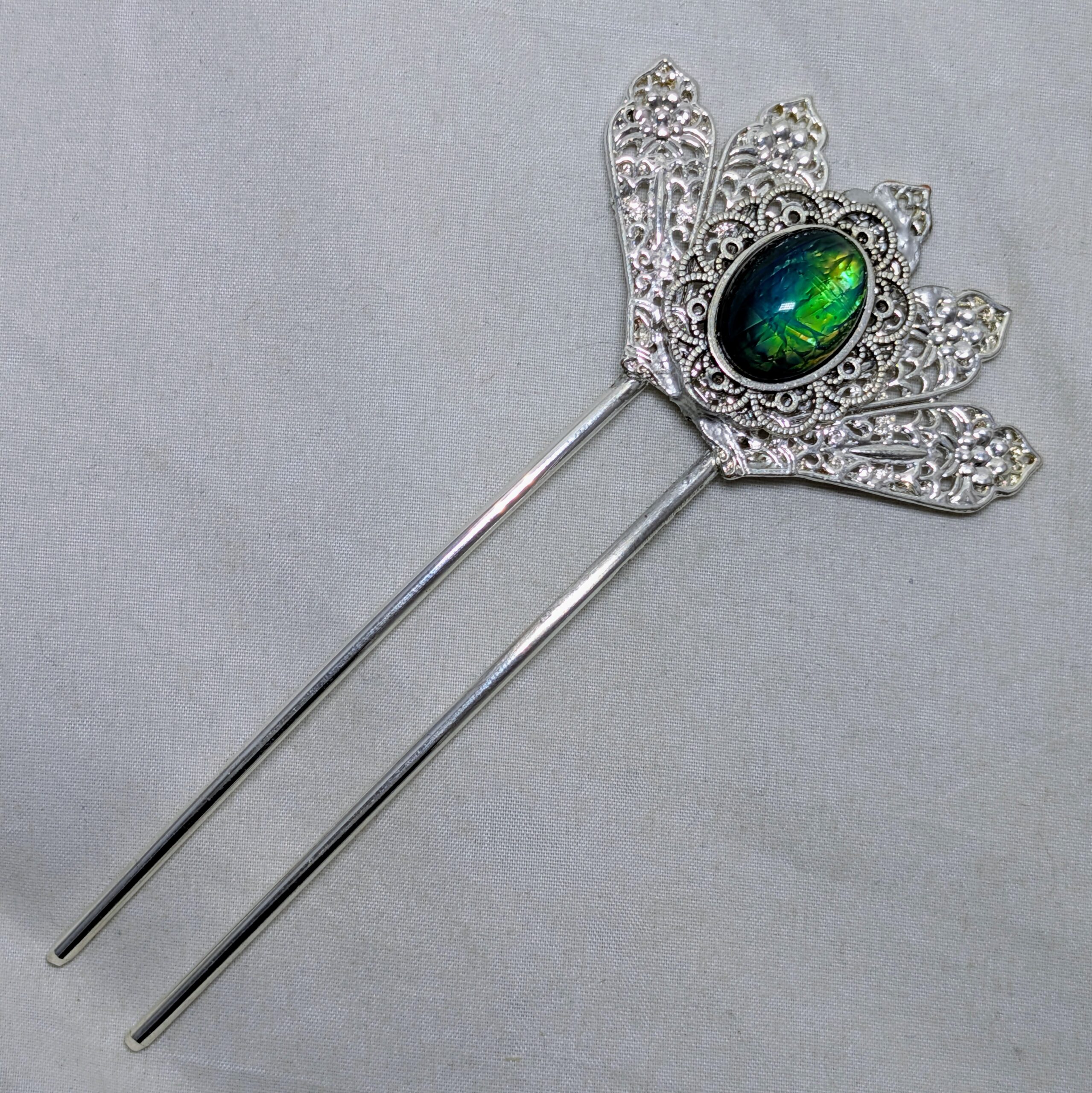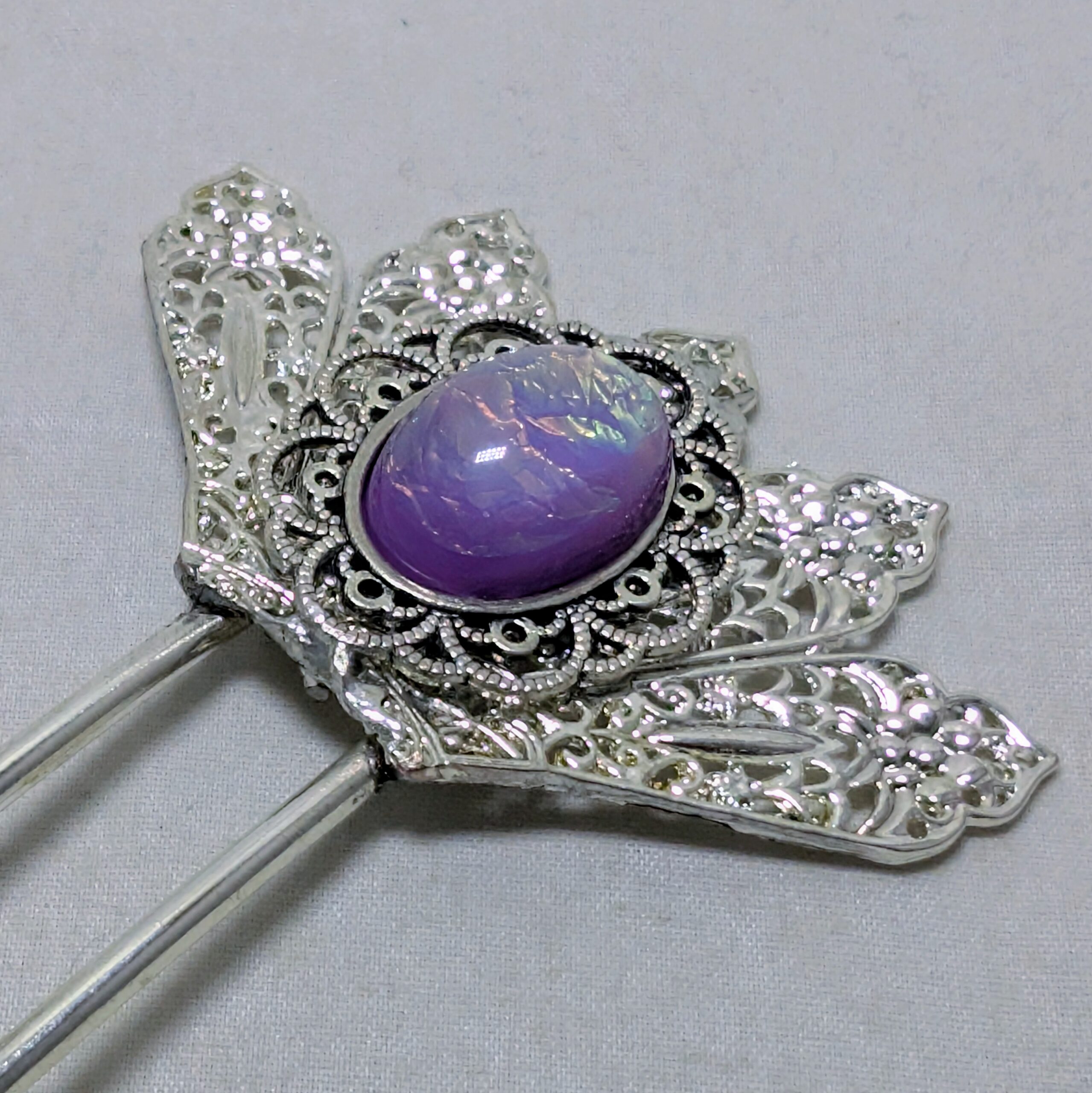 One silver-plated hair fork with a crown-like soldered silver alloy top, decorated with resin opals or cameo cabochons. These ones have a nice curve to fit along your head, which makes them even more comfortable than the usual ones!