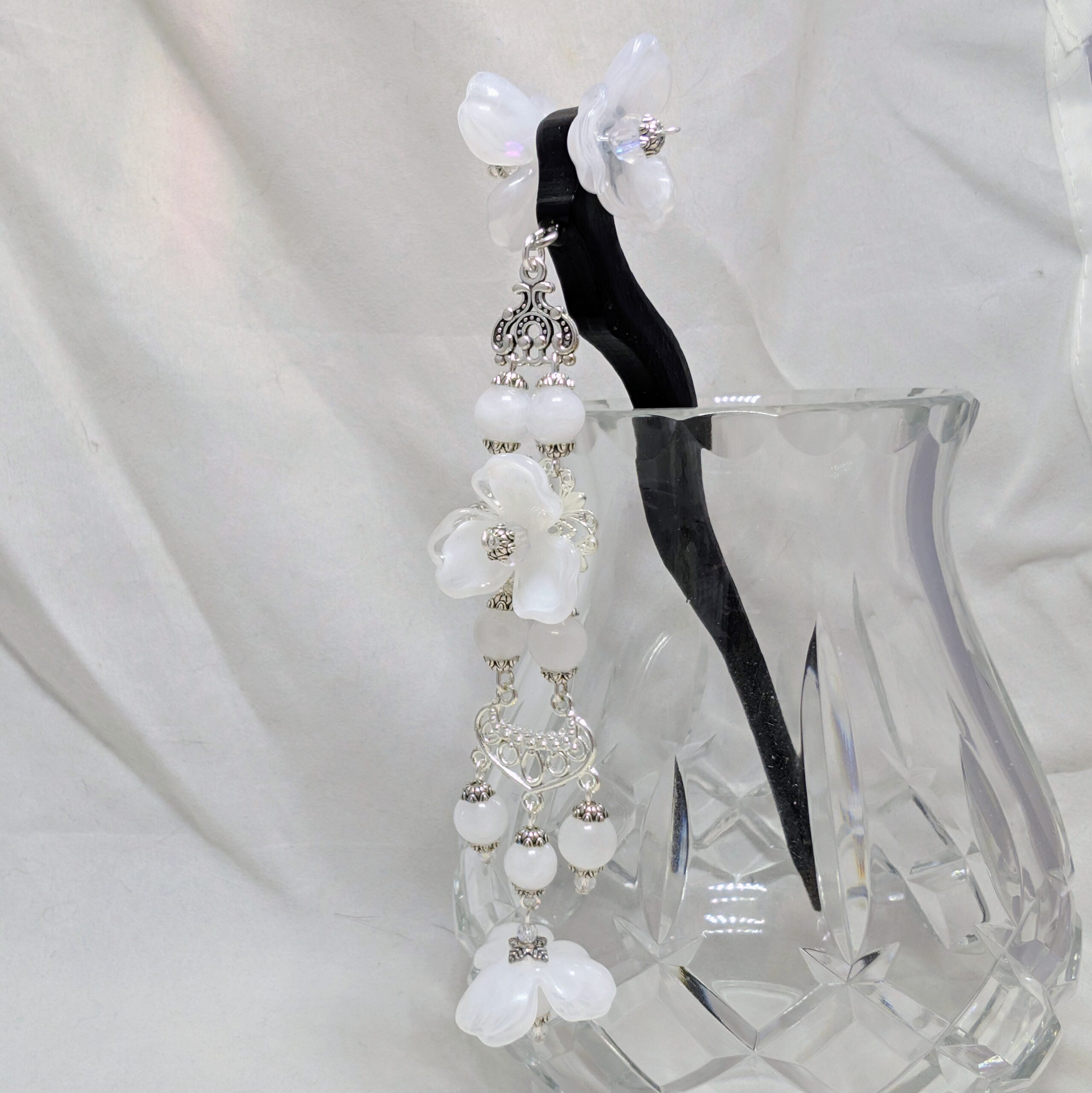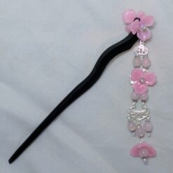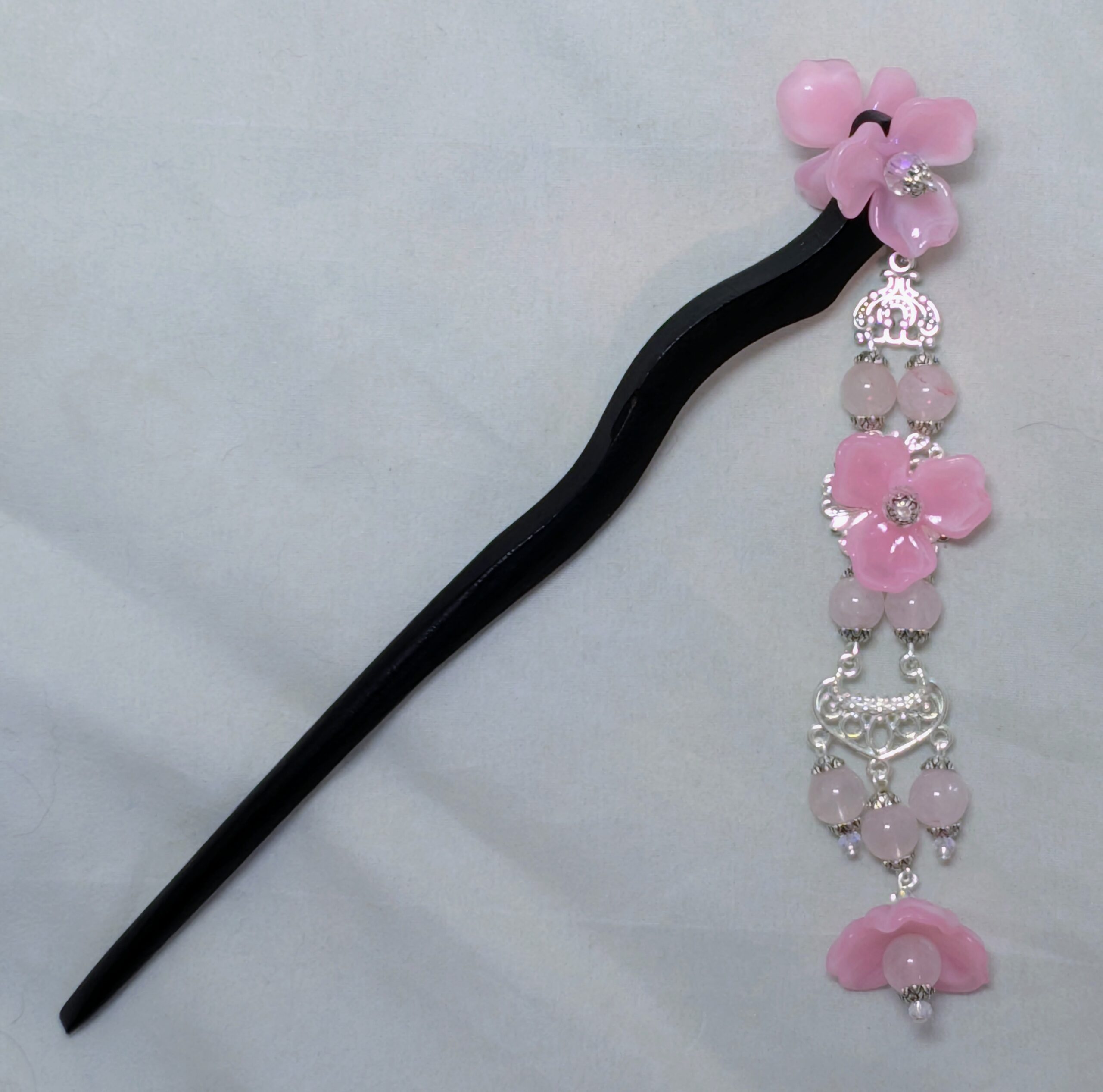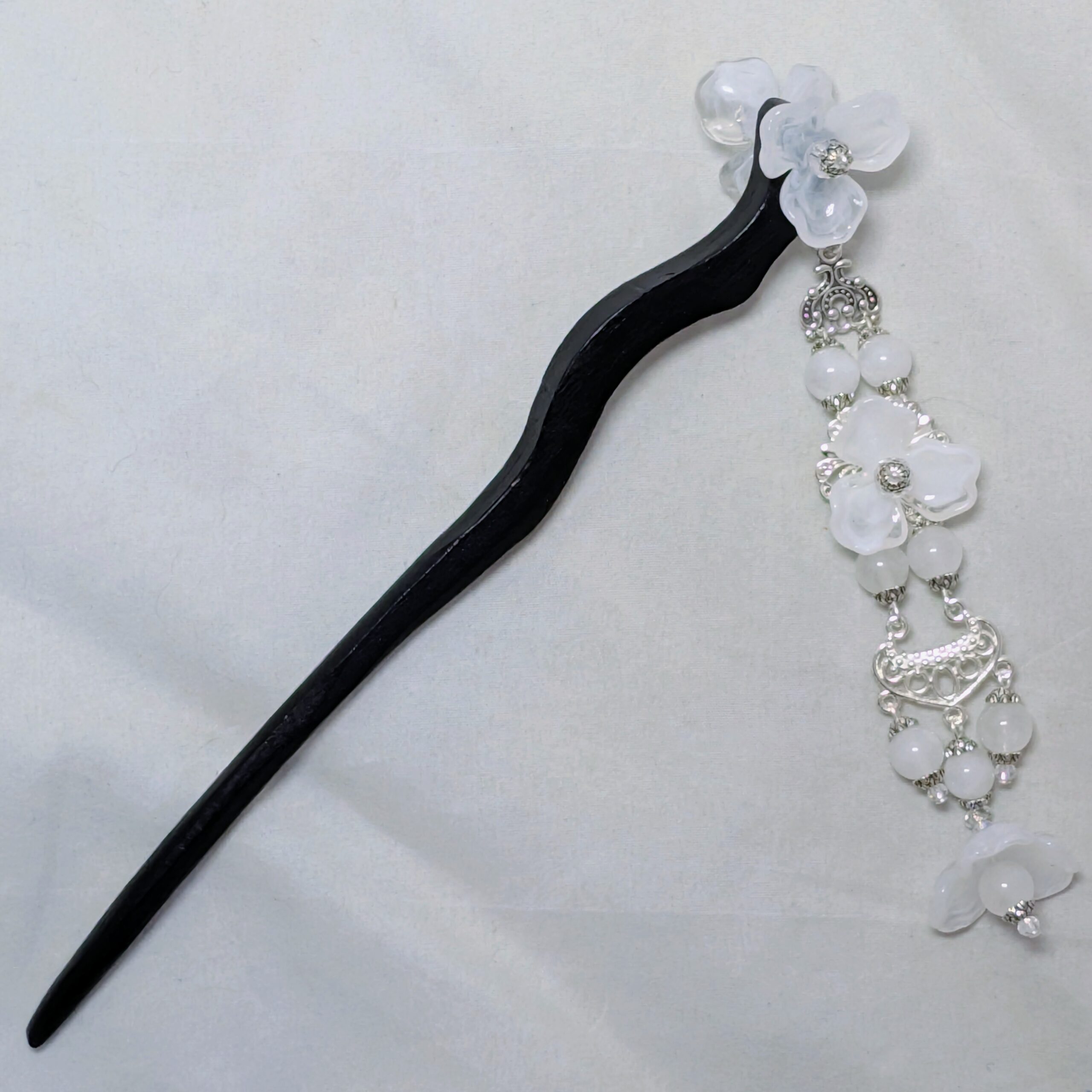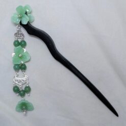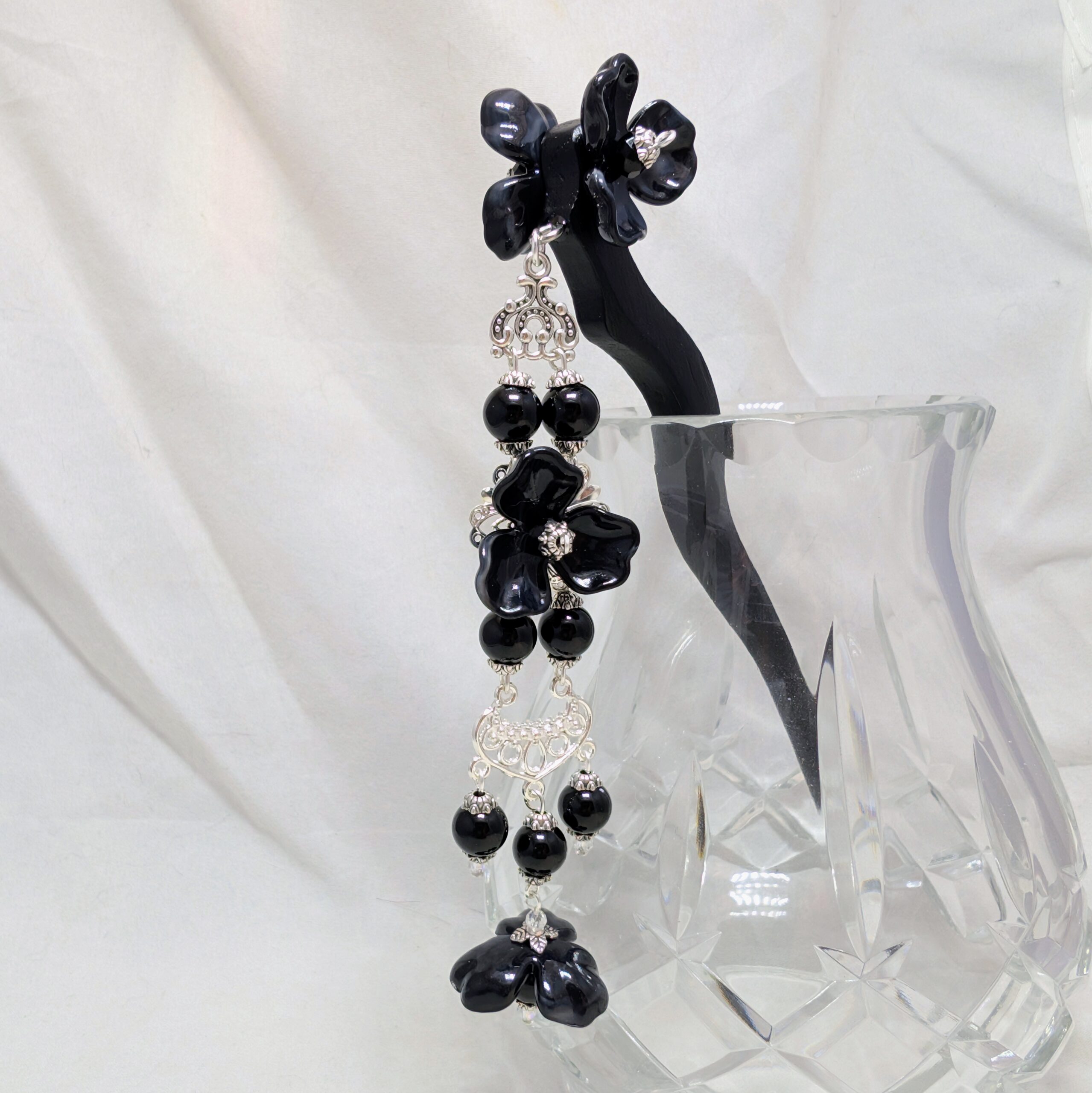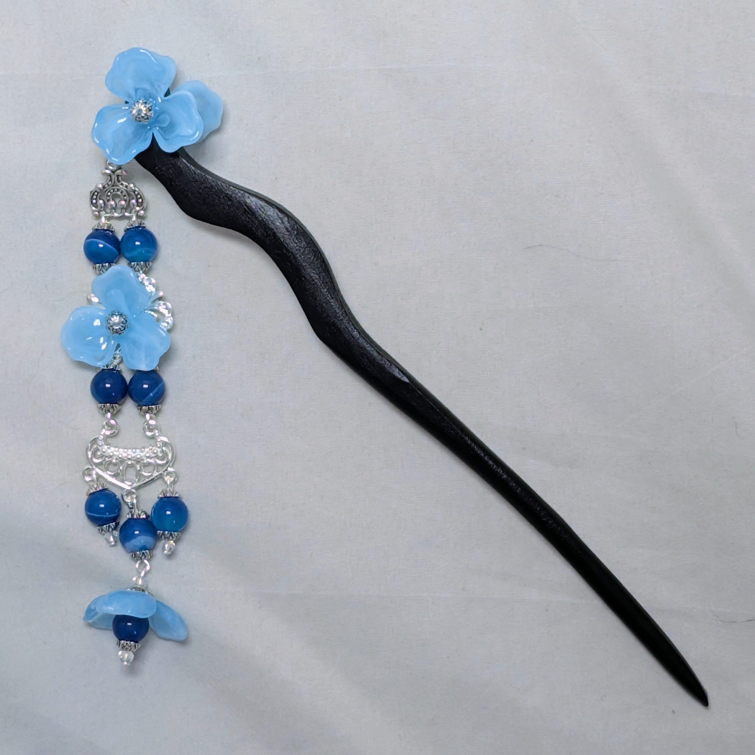 The decorations on the stick itself are double-sided, so you can dress it to whichever side makes you happiest . . . or get two, and wear ’em on either side. The dangle is single-sided, to help keep it from catching in your hair.